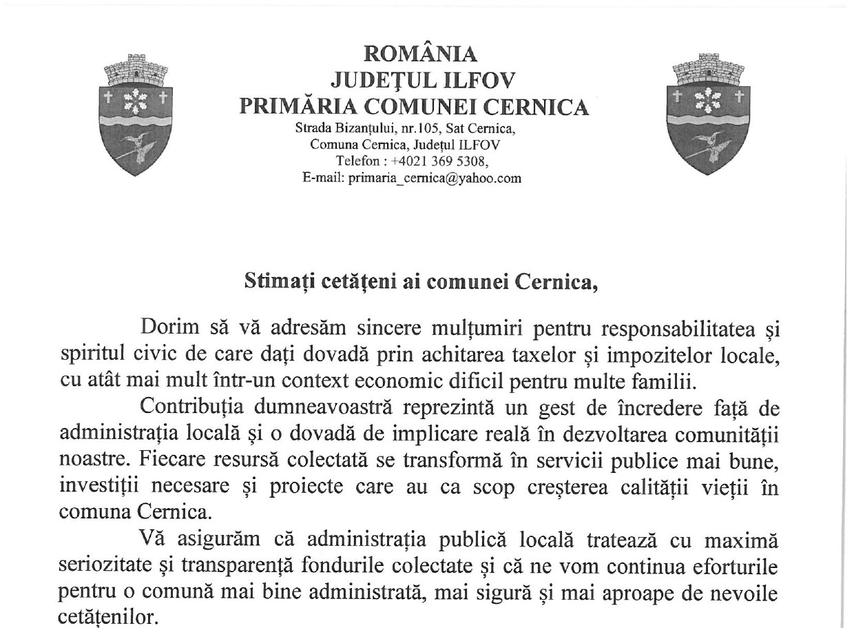 Comunicat de presa Primaria Cernica - Taxe si impozite locale.