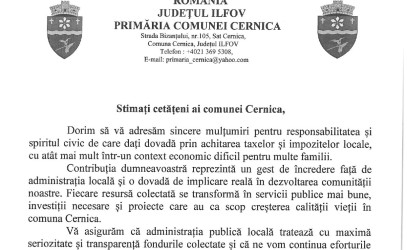 Primăria Comunei Cernica a transmis un mesaj de mulțumire cetățenilor pentru responsabilitatea și spiritul civic demonstrate prin achitarea taxelor și impozitelor locale, într-un context economic dificil.