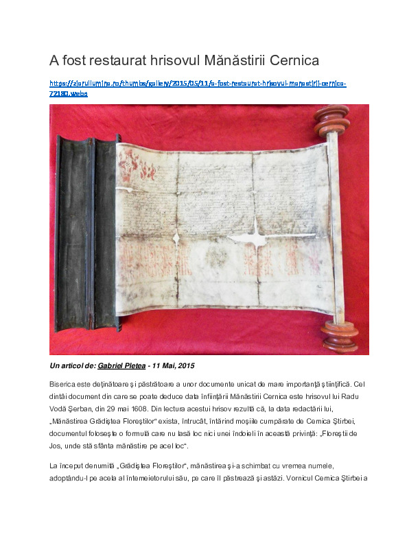 Nenumărate sunt documentele prin care se dăruiesc mănăstirilor moșii, sate, venituri, scutiri de dări și slujbe etc., astfel că la secularizarea averilor mănăstirești, aproape o treime din totalul teritoriului ambelor țări române era în mâinile lor. Această putere economică determina și rolul foarte însemnat pe care l-a jucat Biserica în conducerea treburilor politice ale acestor țări. După secularizarea averilor mănăstirești, la 24 august 1864, în depozitele Arhivelor Statului au intrat cele mai vechi documente din Țara Românească și Moldova, scrise în diferite limbi, cu sigilii în chinovar sau ceară roșie, dar toate cuprinzând informații foarte importante pentru istoria poporului român. Numărul documentelor mănăstirești intrate în Arhivele Statului din București după 1864 este foarte mare și acestea acoperă o perioadă de cinci secole, care începe cu anul 1374 și până aproape de sfârșitul secolului al XIX-lea. Cea mai mare parte a lor privește epoca feudală. Printre acestea se află cel mai vechi document original din Țara Românească, documentul din 1374 de la Vladislav voievod, scris pe pergament (fig. 1), precum și cel mai vechi document pentru Moldova, care datează din 1392, de la Roman voievod (fig. 2). Numărul documentelor de importanță deosebită pentru istoria patriei și a poporului român este foarte mare, iar problemele la care se referă au fost semnalate în lucrarea de față.