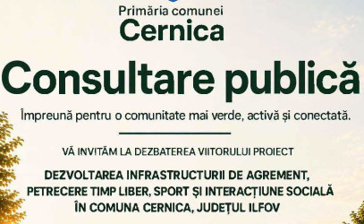 Primăria comunei Cernica a anunțat astazi 20.04.2026, o „consultare publică” pentru miercuri, 22 aprilie 2026, orele 14:30, la sediul instituției, pe tema unui viitor proiect privind „dezvoltarea infrastructurii de agrement, petrecere timp liber, sport și interacțiune socială”. Numai că, din felul în care a fost făcut anunțul, se pun si rămân mai multe întrebări decât răspunsuri.
