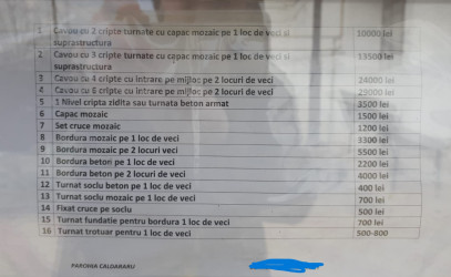 Mai jos va prezentam o lista de preturi, primita de la unii din locuitori din parohia Caldararu, Cernica, pentru o parte din lucrarile / serviciile necesare ca Dvs. sa puteti dormi linistiti si pentru a putea fi in ordine cu comfortul si cu locul unde va veti petrece vesnicia. In aceasta lista nu sunt incluse alte servicii funerare (sicriu, imbracaminte, lumanari, imbalsamare, coroane de flori, taxe si alte servicii funerare bisericesti, pomeni, acte deces, capela, costul propriu zis al