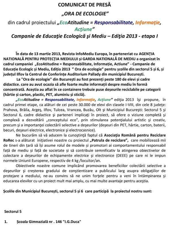 Revista InfoMediu Europa, în parteneriat cu AGENŢIA NAŢIONALĂ PENTRU PROTECŢIA MEDIULUI şi GARDA NAŢIONALĂ DE MEDIU are deosebita plăcere şi onoare de a vă invita să participaţi la FESTIVITATEA DE PREMIERE din cadrul proiectului „EcoAtitudine = Responsabilitate, Informaţie, Acţiune" - Campanie de Educaţie Ecologică şi Mediu – Ediţia 2013, Etapa I pentru Municipiul Bucureşti şi Jud.Ilfov.