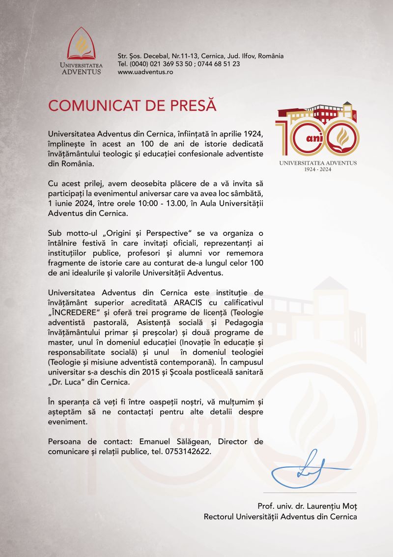 În anul 2024 Universitatea Adventus din Cernica împlinește 100 de ani de la prima promoție care a început studiile la Institutul Biblic de la Focșani, în primăvara anului 1924. În așteptarea revenirii apropiate a Mântuitorului, considerăm că este un mare har să fim parte a acestui moment istoric. De aceea, vă invităm să participați la al doilea eveniment al acestui centenar, eveniment programat în Campusul adventist din Cernica în Sabatul din 31 mai – 1 iunie 2024.